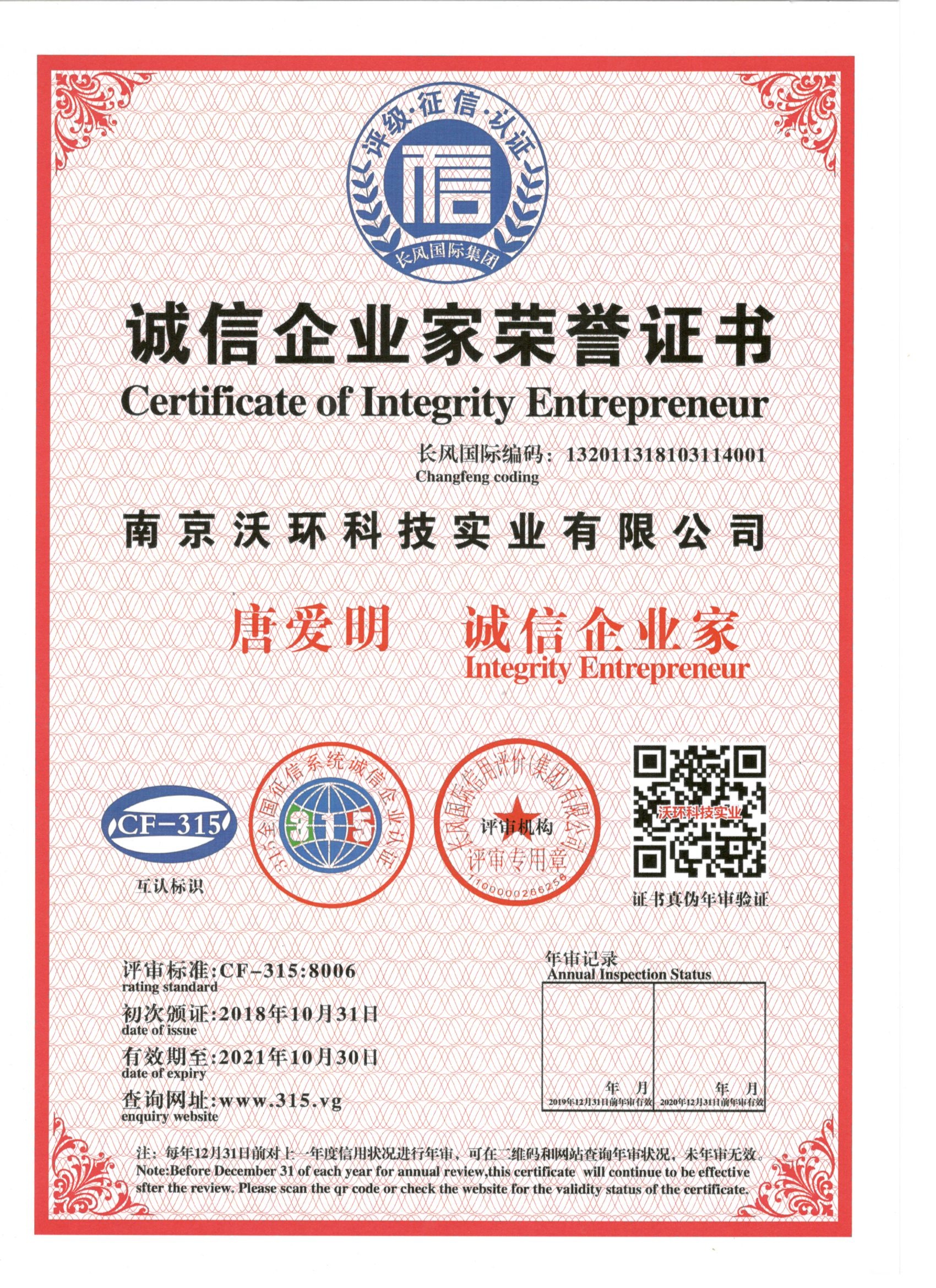 熱烈祝賀南京沃環(huán)公司唐愛明先生被專業(yè)評審機構(gòu)-長風國際集團評為誠信企業(yè)家,特發(fā)此證書
